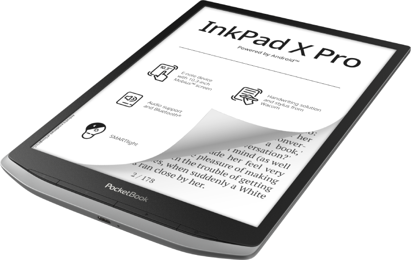 PocketBookil on hea meel tulla välja väga oodatud e-märkmiku ja lugemisseadmega – PocketBook InkPad X Pro. Uusimal Android™-i jõul töötaval e-märkmikul on vapustav 10,3-tolline E Ink Mobius™ ekraan, see toetab käsitsi kirjutamist ja komplekti kuulub ka Wacomi pliiats. Seade toetab ka helivorminguid, sellel on Bluetooth® ja reguleeritav SMARTlight-funktsioon.